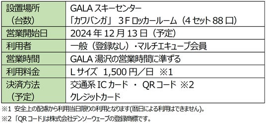 - 株式会社ガーラ湯沢(新潟県湯沢町、代表取締役:鴇澤 良次) と株式会社JR東日本スマートロジスティクス(東京都墨田区、代表取締役社長:市原 康史)とは、GALAスキーセンター「カワバンガ」3Fロッカールーム内へ多機能ロッカー『マルチエキューブ』を新たに設置いたします。