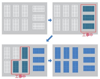 ▶工期が短く、工事による休業は必要ありません。工法を一新し独自開発したカーポート架台で、工期の大幅短縮に成功。最短2か月で引き渡しが可能です。また、区画ごとに工事を行うため、工事休業の必要はありません。