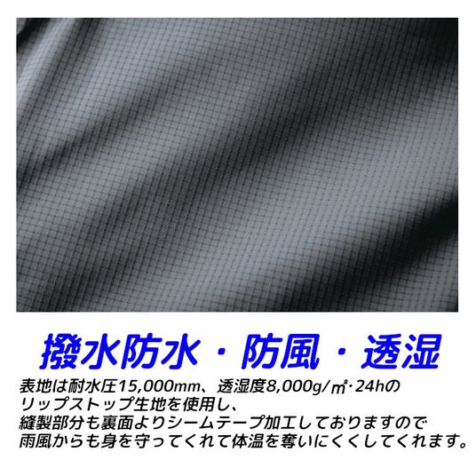 耐水圧15,000mm、透湿度8,000g/平方メートル ・24hの素材を使用。雨や雪の日も安心して着用できます。
