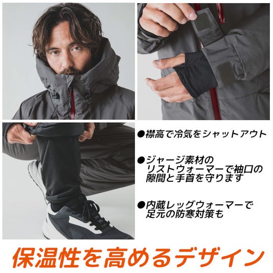 三首(首・手首・足首)を暖かく包み込むウォーマー機能とムレを軽減するベンチレーションシステムを搭載。