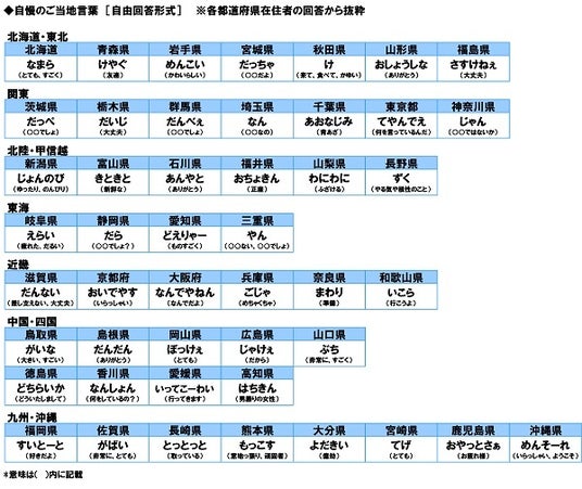 ◆自県の好きなご当地言葉 青森県「けやぐ」、宮城県「だっちゃ」、山形県「おしょうしな」、茨城県「だっぺ」、新潟県「じょんのび」、富山県「きときと」、福井県「おちょきん」、山梨県「わにわに」、岐阜県「えらい」、愛知県「どえりゃー」、滋賀県「だんない」、大阪府「なんでやねん」、兵庫県「ごじゃ」、奈良県「まわり」、徳島県「どちらいか」、福岡県「すいとーと」、長崎県「とっとっと」、熊本県「もっこす」、沖縄県「めんそーれ」