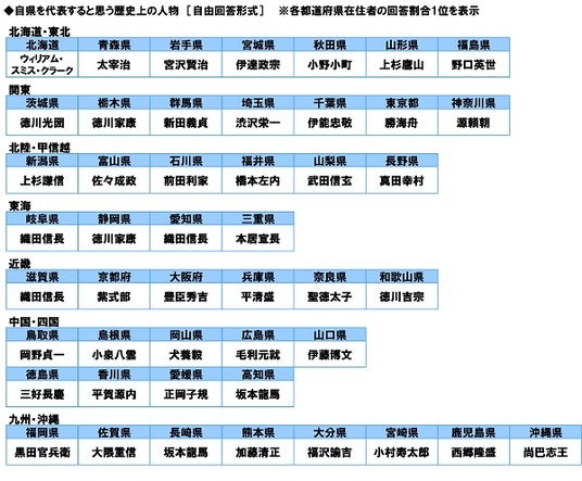 各都道府県の在住者(各都道府県100名)に、自県を代表すると思う歴史上の人物を聞いたところ、北海道では「ウィリアム・スミス・クラーク」、岩手県では「宮沢賢治」、宮城県では「伊達政宗」、秋田県では「小野小町」、茨城県では「徳川光圀」、埼玉県では「渋沢栄一」、千葉県では「伊能忠敬」、東京都では「勝海舟」、神奈川県では「源頼朝」、新潟県では「上杉謙信」、石川県では「前田利家」、山梨県では「武田信玄」、京都府では「紫式部」、大阪府では「豊臣秀吉」、兵庫県では「平清盛」、奈良県では「聖徳太子」、香川県では「平賀源内」、愛媛県では「正岡子規」、熊本県では「加藤清正」、大分県では「福沢諭吉」、鹿児島県では「西郷隆盛」、沖縄県では「尚巴志王」といった人物が挙げられました。