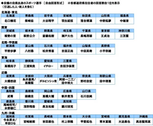 各都道府県の在住者(各都道府県100名)に、自慢の自県出身のスポーツ選手(引退した人・故人を含む)を聞いたところ、北海道では「北口榛花さん」、岩手県では「大谷翔平さん」、宮城県では「羽生結弦さん」、群馬県では「斎藤佑樹さん」、埼玉県では「瀬戸大也さん」、千葉県では「長嶋茂雄さん」、神奈川県では「三笘薫さん」、新潟県では「平野歩夢さん」、富山県では「八村塁さん」、石川県では「松井秀喜さん」、岐阜県では「高橋尚子さん」、静岡県では「三浦知良さん」、愛知県では「イチローさん」、三重県では「吉田沙保里さん」、大阪府では「ダルビッシュ有さん」、兵庫県では「阿部一二三さん/田中将大さん」、島根県では「錦織圭さん」、岡山県では「高橋大輔さん」、広島県では「新井貴浩さん」、山口県では「石川佳純さん」、愛媛県では「長友佑都さん」、高知県では「藤川球児さん」、福岡県では「今永昇太さん/早田ひなさん」、佐賀県では「宮崎敏郎さん」、大分県では「甲斐拓也さん」、沖縄県では「具志堅用高さん」といった選手が挙げられました。(図10)