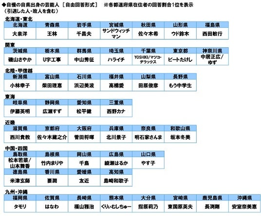 各都道府県の在住者(各都道府県100名)に、自慢の自県出身の芸能人(引退した人・故人を含む)を聞いたところ、北海道では「大泉洋さん」、青森県では「王林さん」、宮城県では「サンドウィッチマン」、秋田県では「佐々木希さん」、福島県では「西田敏行さん」、茨城県では「磯山さやかさん」、群馬県では「中山秀征さん」、埼玉県では「ハライチ」、石川県では「浜辺美波さん」、福井県では「高橋愛さん」、山梨県では「田原俊彦さん」、静岡県では「広瀬すずさん」、愛知県では「松平健さん」、滋賀県では「西川貴教さん」、京都府では「佐々木蔵之介さん」、大阪府では「菅田将暉さん」、兵庫県では「北川景子さん」、鳥取県では「松本若菜さん/山本舞香さん」、岡山県では「千鳥」、広島県では「綾瀬はるかさん」、山口県では「やす子さん」、徳島県では「米津玄師さん」、愛媛県では「友近さん」、高知県では「島崎和歌子さん」、長崎県では「福山雅治さん」、熊本県では「くりぃむしちゅー」、大分県では「指原莉乃さん」といった芸能人が挙げられました。(図9)