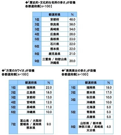 【方言のカワイさ自慢】では1位「福岡県」(22.0%)、2位「広島県」(18.0%)、3位「京都府」(13.0%)と、福岡県が6年連続1位、【美男美女の多さ自慢】では1位「福岡県」(18.0%)、2位「熊本県」(17.0%)、3位「秋田県」「沖縄県」(同率10.0%)と、福岡県が5年連続の1位でした。1位の「福岡県」について理由をみると、【方言のカワイさ自慢】では「博多弁は可愛いとよく言われる」(20代女性)、【美男美女の多さ自慢】では「博多美人と言われるだけあり、目鼻立ちがしっかりした美男美女が多い」(40代女性)といった回答がありました。(図12)(図13)
