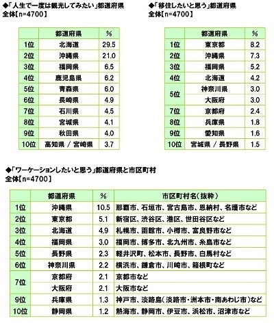 【47都道府県 観光したい・移住したい・ワーケーションしたい都道府県ランキング】