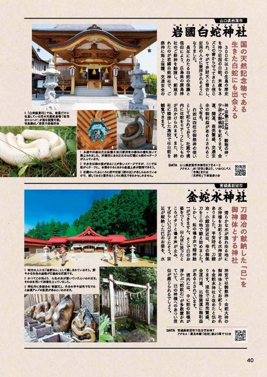 日本全国には多くの蛇にまつわる神社やスポットがあります。本書では、虻田神社(北海道)、金蛇水神社(宮城県)、白蛇弁財天(栃木県)、蛇窪神社(東京都)、大神神社(奈良)、岩国白蛇神社(山口県)、阿曽白水龍神権現(熊本県)など、北海道から九州まで19社と、2025年注目のパワースポット2箇所を紹介。気になる神社やスポットがあれば、訪れてみてはいかがでしょうか。