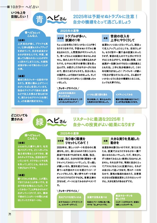四柱推命の十干をベースにした紫月香帆さんオリジナルのヘビ占いを掲載。誕生年月日をもとに算出した数字にちなんだ「10色のヘビ」が、あなたの化身となり、全体運、金運など運勢を占います。あなたのカラーヘビにちなんだラッキーアドバイスも必見です。