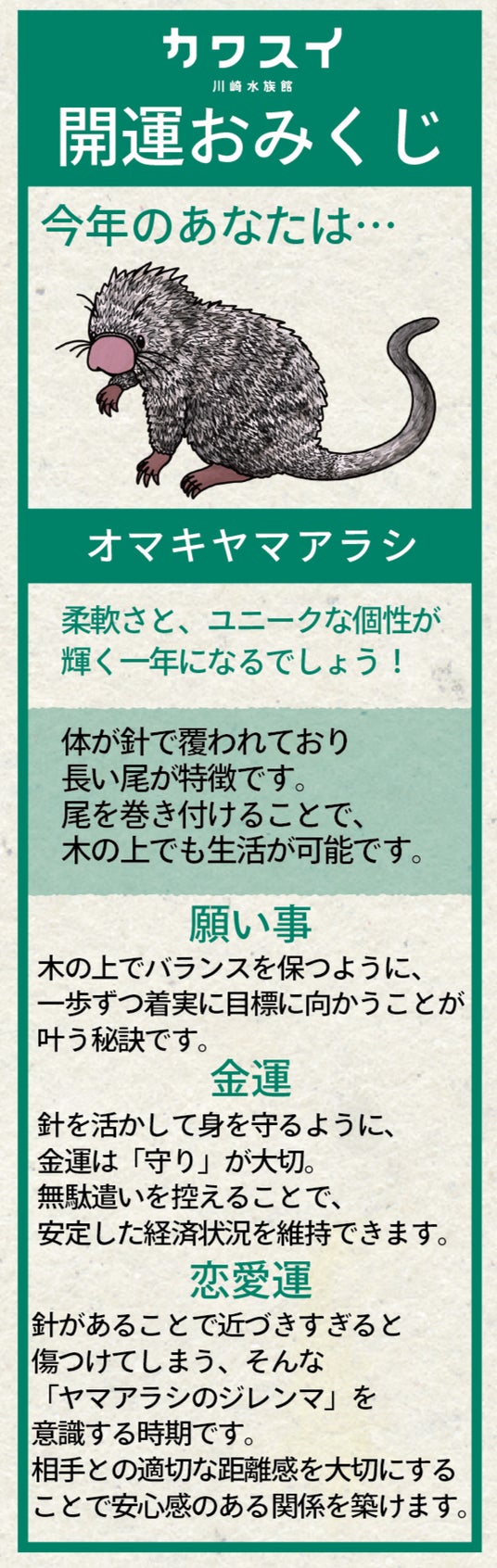 生きものたちにちなんだオリジナルおみくじが今年も登場!運勢を占うだけでなく、生きものの知識や魅力を感じる全16種のデザインをお楽しみください。