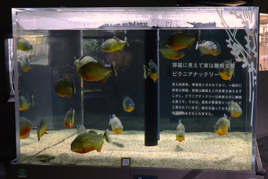 ピラニア水槽横の壁に設置された大型解説板で、生態系や飼育の詳細をより深く学ぶことができます。