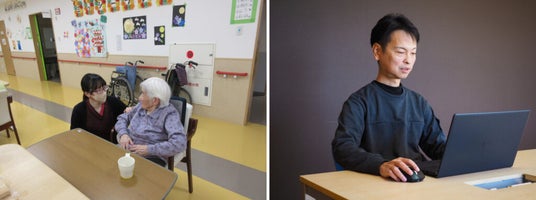 左:介護老人保健施設の利用者様と(植村さん) / 右:DXを通して地域の小規模事業者を支える(片岡さん)