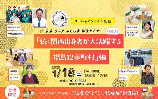 第17回目となる今回のセミナーテーマは「続:関西出身者が大活躍する福島12市町村」です。福島12市町村で活躍されている関西とつながりがあるゲストの方々をお招きし、お仕事や現地での暮らしや、遠方から見たときの福島12市町村の魅力についてたっぷりお話いただきます。