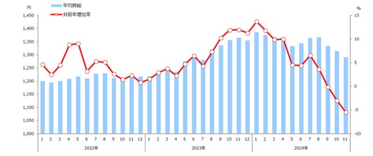 11月のアルバイト・パートの平均時給は1,291円(前年比74円減、前月比24円減)、また「バイトル」に掲載された求人件数は約330,000件となり、前年比7.9%増、前月比5.6%増となりました。