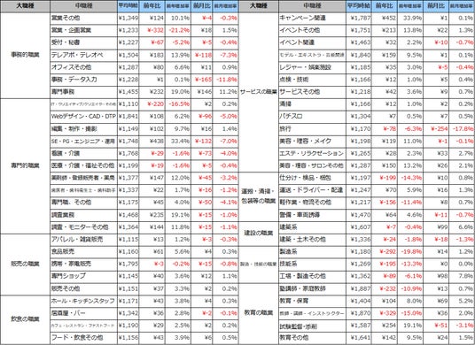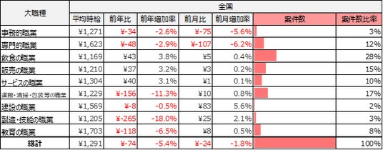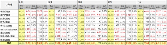 事務的職業は1,271円(前年34円減、前月比75円減)、専門的職業は1,623円(前年比48円減、前月比107円減)、飲食の職業は1,169円(前年比43円増、前月比5円増)、販売の職業は1,210円(前年比37増、前月比3円増)、サービスの職業は1,304円(前年比40円増、前月比1円増)、運搬・清掃・包装等の職業は1,229円(前年比156円減、前月比10円増)、建設の職業は1,569円(前年比8円減、前月比83円増)、製造・技能の職業は1,205円(前年比265円減、前月比25円増)、教育の職業は1,703円(前年比118円減、前月比8円増)となりました。