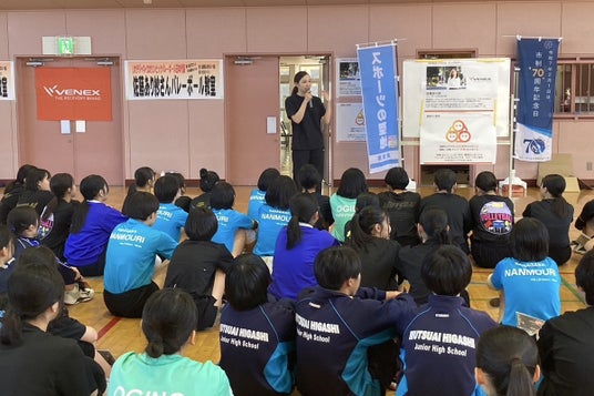 当日は、約130人が参加。佐藤あり紗さんが各地で実施しているバレーボールを2個使ったレッスン「2個バレーボール」を体験したり、基礎やコツをはじめとした講習会を実施しました。バレーボール競技をするうえで、仲間へ声に出して伝えること、ほめることなど、コミュニケーションが大切であると伝えられ、参加した中学生は真剣なまなざしで話を聞いたり実践したりしながらも、笑い声や笑顔が見られる場面もあり、楽しんでいる様子が見られました。イベントの最後には、まず健康な心と体づくりが重要になるなか「運動」「栄養」「休養」それぞれが大切であり、特に見落としがちな「休養」について中学生の頃から知っていただけるよう伝えられました。