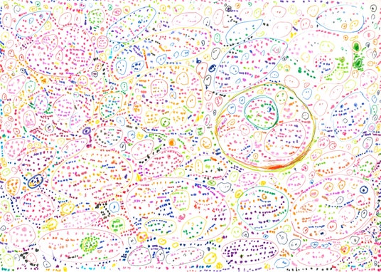 作家:松崎 聡氏 / 社会福祉法人征峯会 指定障害者支援施設ピアしらとりに入所している。水性ペンを使用し、ひとつずつ丁寧に点を打つ。周りを穏やかに見つめる姿勢が作品に反映されている。