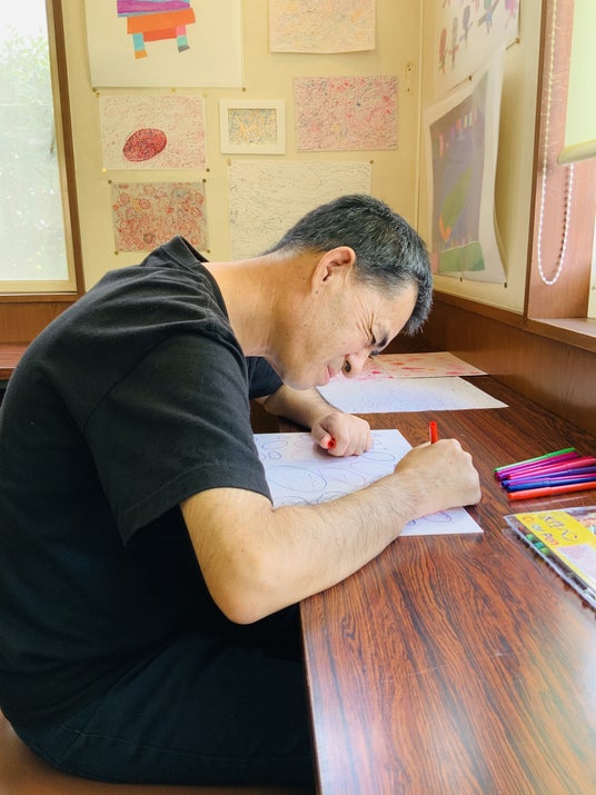 作家:寺田 和也氏 / 社会福祉法人征峯会 指定障害者支援施設ピアしらとりに入所している。その時々の気分に合わせて画材を選び、優れた色彩感覚と感受性を持ち合わせ、感じるままに日々製作を行っている。ハッとするようなその鮮やかさ、線の大胆さ、見る方によっては捉え方が変化する作風は人々を魅了する。