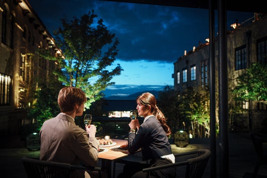 エレガントな雰囲気をもち、高さ4メートルを超える天井高で開放感あふれるレストラン・ライブラリーは、18時のSUSHI-BAR営業時間を迎えると、トーンダウンした照明にアップテンポなBGMと、モダンで上質なバーの装いに変わります。レストラン・ライブラリーに併設されたオープンテラスでも、ライトアップされたホテルの煌めくコートヤードを見ながら食事をお楽しみいただけます。