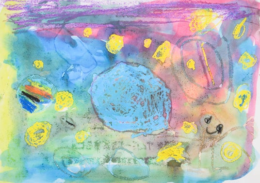 僕の絵を選んでくれてありがとうと思いました。大好きな友達と弟と3人で、宇宙の中のプールで遊びたいと思って描きました。星に見えるように形をギザギザにして工夫しました。星を描くのが難しかったです。宇宙のことを考えながら絵を描くのが楽しかったです。