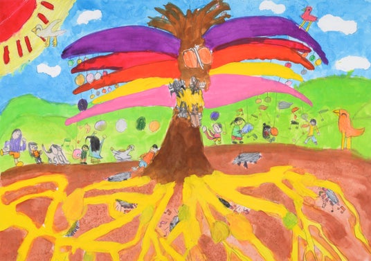みんながしあわせになれたらいいなと思ってかきました。ゴールドにえらんでもらえてすごくうれしいです。わたしは、おじいちゃん、おばあちんの家にあるとっても大きなケヤキの木が大好きです。ひいひいおじいちゃんがうえてくれた木です。いつもわたしたちを見まもってくれている大事な木を守りたいと思い、この作品をかきました。きれいな色をたくさん使って、木や生きもののもつパワーがつたわるように工夫しました。やわらかいやさしい色をだすのが楽しかったけど、むずかしかったです。生きものと人間が思いやりをもって仲よく協力していけば、きっとすてきなみらいになると思います。