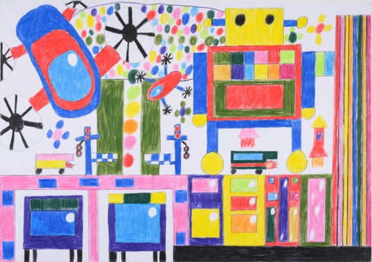 ずっとドコモ未来ミュージアムに応募していたので受賞できてとても嬉しいです。未来ではこういうものがあったらいいな、をそうぞうして描きました。空とぶ車のまどに光がさしているみたいになるように工夫しました。ロボットの色ぬりがたいへんでした。これまで考える機会がなかったけど、そうぞうしてみたら空とぶ車やきょだいロボなど今までにないものがうかびあがってわくわくしました。