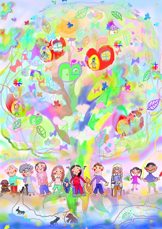 受賞して、びっくりしました。そして、とてもうれしいです。世界中のみんなを笑顔にできる木があったらいいなぁと思って描きました。木の葉っぱを元気が出るようなあったかい色にして、葉っぱや根っこに幸せの実をたくさんつけました。人も動物も最高の笑顔に描きたかったので、少し大変でした。ぼくは夢がいっぱいあるので、未来が楽しみです。世界中のみんなが、楽しく仲良く笑顔でいられるような未来になってほしいです。
