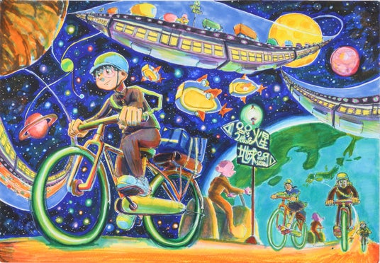 思い入れのある絵だったので受賞できて本当に嬉しかったです。光栄です。最初は広大な宇宙を描きたいと思い、地球に住む私たちとどうやって結びつけようかと考えました。そこで「旅行だけに留まらず当たり前のように行き来できるようにしよう!」と思いつきました。そこから勢いでアイデアを描きました。宇宙に奥行きが生まれるように、曲線に任せて描きました。あと、とにかく楽しく描こうと心がけました。惑星の色のチョイスや暗い宇宙を明るく描くのが難しかったです。言い方が乱暴ですが、白紙の未来をこれから生きる私たちは、良くも悪くも願いや理想像を描きたい放題だなとふと思いました。どんな世の中になるかは、私たち次第。そんなとてつもない責任を感じ、背筋が少し伸びました。
