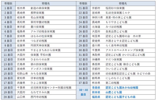 寄贈先は30都道府県40園になります。青字は今回寄贈が決定した園です。