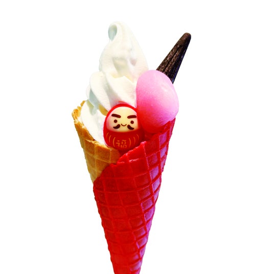 一番人気の「牧場ミルク」を紅白カラーのワッフルコーンで!だるまのチョコ、フルーツジャムが