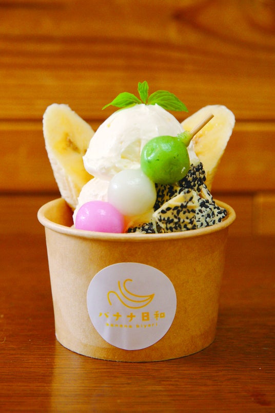 角切りバナナとバナナソフトクリームに、生クリーム、南部煎餅、三色団子をトッピングした和洋