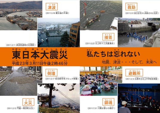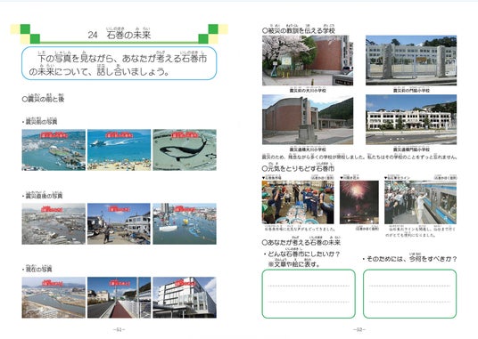 石巻市教育委員会では、震災を教訓に地域の特性を踏まえた実践的な防災教育の充実と児童・生徒の防災対応能力を育成することを目的として、防災教育副読本「未来へつなぐ」を編集・発行しています。副読本は小学校1、2、3年版、小学校4、5、6年版、中学生版の3種類で、いずれも「備える」「知る」「震災のとき」「応援ありがとう」「未来へつなぐ」の5章からなっており、各小・中学校では学級活動や避難訓練の事前・事後指導の資料などに活用しています。