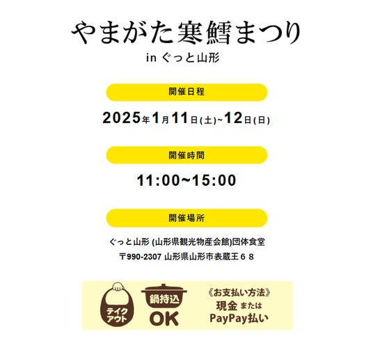 株式会社庄交コーポレーション(所在地:山形県鶴岡市、代表取締役:近藤 司)が運営する土産物専門店「庄内観光物産館」は、2025年1月11日(土)-12日(日)に庄内の冬の味覚「寒鱈汁」が楽しめる「やまがた寒鱈まつり」を"ぐっと山形"[〒990-2307 山形県山形市表蔵王68 山形県観光物産会館]にて開催します。