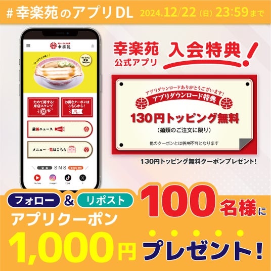 幸楽苑公式Xアカウント(@kourakuen_pr)が投稿するキャンペーン対象ポストからのご応募で、抽選で100名様に幸楽苑公式アプリの1,000円分クーポンをプレゼントいたします。