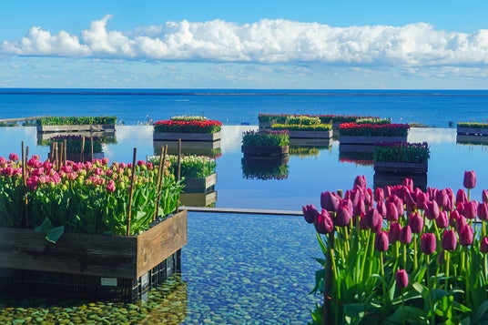 冬の園内を彩る“アイスチューリップ”を園内の2か所で展示しています。「グラスハウス」では太平洋を望む暖かい室内から、花が水面に鏡面反射した幻想的な花風景、「記念の森レストハウス」では木漏れ日差し込む建屋の周辺に広がる、メルヘンチックな花風景をお楽しみいただけます。