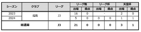 サッカー歴:西一サッカースポーツ少年団→S.F.C.ジェラーレ→ベガルタ仙台Jrユース→ベガルタ仙台ユース→仙台大→福島ユナイテッドFC