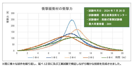 工業試験では、異なる三種の素材を組み合わせ 衝撃力を測定しましたが、何れも基準値となる300Nをクリアし、確かな効果を元に商品化を開始することに至りました。