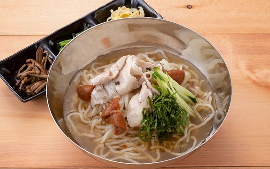 香り高いだしを使ったスープに梅肉と特製梅ダレ、大葉を合わせた爽やかな冷麺。脂の甘い豚肉をのせた、女性に人気の名品です