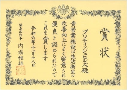 神田外語グループが運営するブリティッシュヒルズ(福島県天栄村)は、令和6年度福島県生活衛生優良施設 知事賞を受賞しました。この賞は、施設の衛生の向上及び関係業界の資質向上に尽力し、他の規範となる優良な施設に与えられます。当ホテルが生活衛生活動の場で、長年にわたりお客様に安心してご滞在いただける施設づくりを続けてきた功績が評価されました。