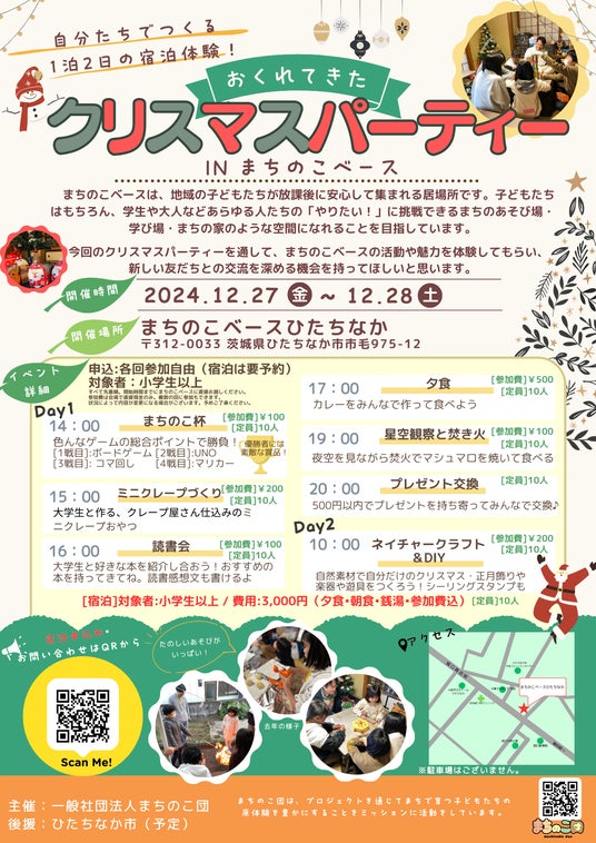 まちのこベースでは、地域の子どもたちを主な対象に今月末の27日(金)14時から翌28日(土)11時までの2日間でお泊り可能のクリスマスイベントの開催を予定しています。