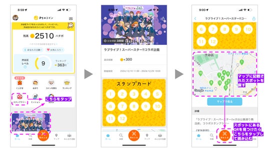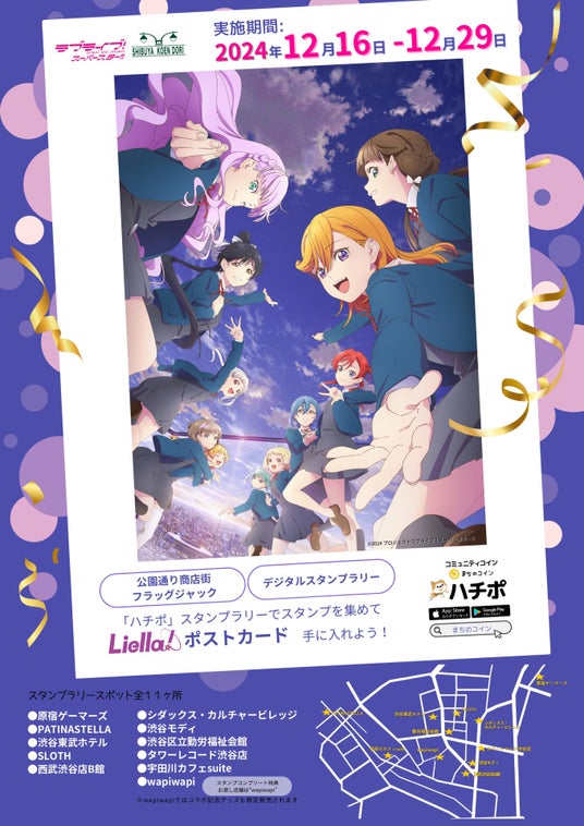 この度、TVアニメ3期が好評放送中の「ラブライブ!スーパースター!!」(※2)と渋谷公園通商店街振興組合(※3)がコラボレーションし、2024年12月16日(月)~29日(日)の期間、「まちのコイン・ハチポ」を使ったデジタルスタンプラリーを実施します。全11スポットを巡り、各スポットに設置されたQRコードを「まちのコイン・ハチポ」で読み取ってスタンプを集めると、「ラブライブ!スーパースター!!」限定ポストカードが手に入る特別企画です。本スタンプラリーをきっかけに、人々が渋谷の街と文化を楽しんで回遊することを促進し、街への愛着の向上など、地域活性につながることを期待しています。
