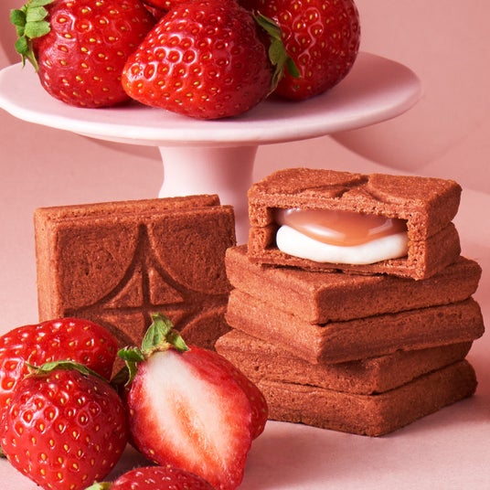 福岡県産あまおう苺のジャムを練り込んだバタークリームとあまおう苺の濃縮果汁を使用したバターキャラメルを、サクサク食感のクッキーではさみました。かじった瞬間に苺の美味しさがあふれ出す、贅沢な一品です。