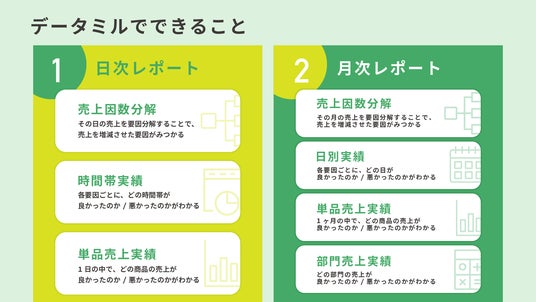 「データミル」は、高機能クラウドPOSレジ「スマレジ」のアプリマーケット向けに提供を開始した、店舗運営者や経営者向けのデータ分析アプリです。本アプリは、スマレジの標準機能で提供される日別、商品別などの売上実績データを活用し、日次および月次の2種類のレポート画面に重要指標を集約しています。前週又は前年と売上実績を比較し、増減要因を特定、改善の着眼点を提供します。