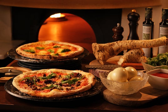 店内のピザ窯で焼き上げる