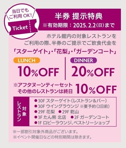 展覧会を愉しんだあとは、展覧会半券を下記施設でご提示いただくことで、ホテル館内施設がお得にご利用できます。