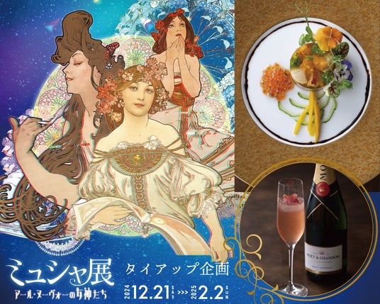 ANAクラウンプラザホテルグランコート名古屋(名古屋市中区、執行役員総支配人:石井 孝治)は、2024.12.21(土)~2025.2.2(日)の期間、隣接する金山南ビル美術館棟(旧名古屋ボストン美術館)にて開催される「ミュシャ展~アール・ヌーヴォーの女神たち~」と併せて愉しめるタイアップランチコース(フランス料理)とカクテルを、最上階にあるスカイレストラン&バー「スターゲイト」にて提供する。また、数量限定で展覧会コラボレーションコースタープレゼントも併せて実施する。