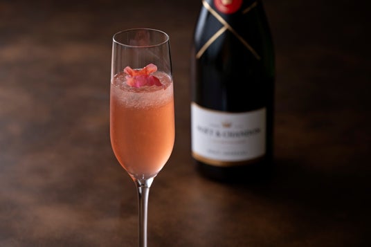 その中でも、シャンパーニュで著名なモエ・エ・シャンドン社の広告デザインは有名です。その優美な花と女性のモチーフからバーテンダーがモエ・エ・シャンドンとピーチやアプリコットを使用したフェスティブシーズンにぴったりのほんのり甘い大人のシャンパンカクテルをご用意しました。