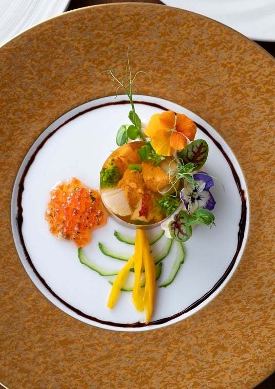コース一皿目は、代表作の一つである「ビザンティン風の頭部」をシェフが大胆に一皿に落とし込んだ嫋やかな美を湛えるアスピック。雲丹やオマール海老等を使い、宝飾デザインも手掛けたミュシャが描く作中のエキゾチックな女性の“髪飾り”そのものといったオードヴルは食べるのも戸惑う究極のフードアートです。続くメインディッシュは、トリュフのリッチな薫りのソースが決めての牛フィレのグリル。そしてシメの一皿は、様々な作品に描かれている華やかなアール・ヌーヴォーを象徴する花々から着想を得た、ベリーの甘未を閉じ込めたホワイトチョコと柚子のソルベとのコンビネーションが彩ります。ミュシャのエキゾチックかつ華やかな作風へ、ホテルシェフとパティシエ、そしてバーテンダーが真摯にオマージュを捧げるコースは、展覧会と併せて“鑑賞”すると一層愉しめる内容です。
