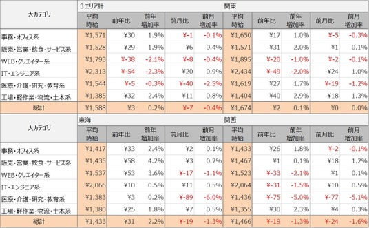 各エリアの平均時給について、関東エリアは1,674円(前年比2円増、前月比±0円)、東海エリアは1,433円(前年比31円増、前月比19円減)、関西エリアは1,466円(前年比19円減、前月比24円減)となりました。