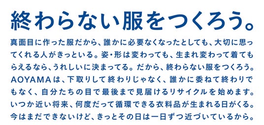 形を変えて、何度も循環して活用される、「終わらない服」をつくる。洋服の青山では、回収された着なくなった服を、古着として活用したり、素材として再生させ、まったく違う形に生まれ変わらせます。私たちは、下取りして終わりじゃなく、誰かに委ねて終わりでもなく、自分たちの目で最後まで見届けるリサイクルに取り組んでいます。