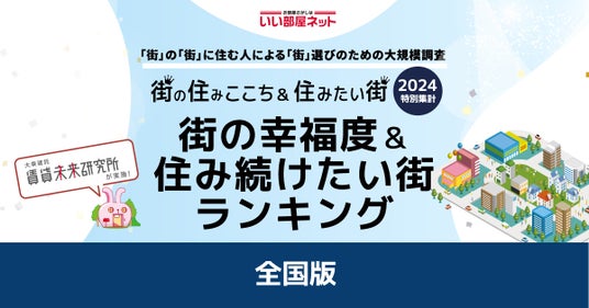 大東建託株式会社(本社:東京都港区、代表取締役 社長執行役員 CEO:竹内啓)は、過去最大級の居住満足度調査を行い、「いい部屋ネット 街の幸福度ランキング2024<全国版>」「いい部屋ネット 住み続けたい街ランキング2024<全国版>」として集計しました。